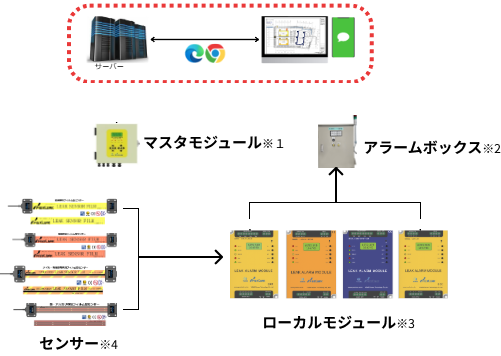 ※1 マスタモジュール LCD Displayでリーク、断線、通信エラーの状態を確認して統合モニタリングシステムにイベント情報を送信する。